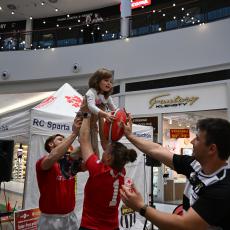Tříletá Ema si zkusila, jaké to je, když chytí míč při autovém vhazování a nad hlavy ji vyzvednou reprezentanti Adam Koblic a Julie Doležilová