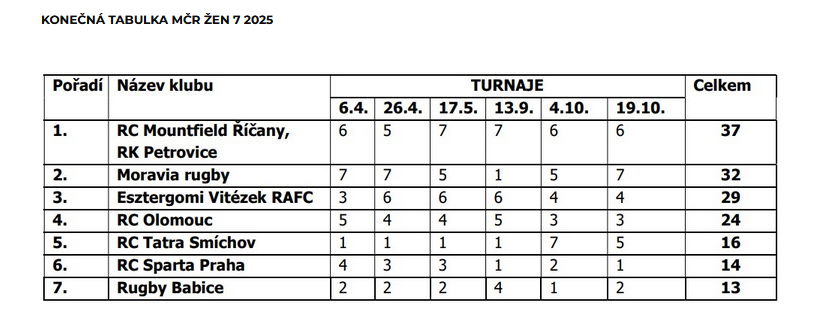 Málo se ví, že domácí série Mistrovství České republiky žen v sedmičkovém ragby se zúčastnilo celkem jen sedm celků, z nichž jeden, tým z maďarské Ostřihomi, byl ze zahraničí a k tomu ještě několik rakouských hráček z Donau Vídeň zase nastoupilo za Olomouc.
