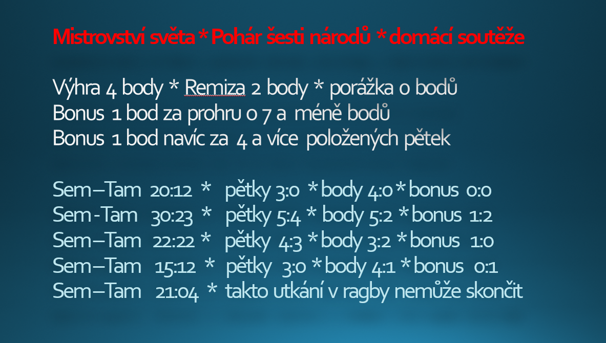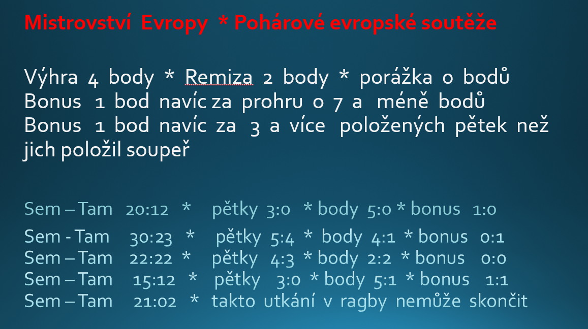 Na konci ragbyového utkání je hned po výsledku důležité znát jiné údaje, kterým není poločasové skore, ale počet položených pětek. Podle nich se totiž udělují bonusové body a aby to nebylo jednoduché, děje se v různých soutěžích jinak.