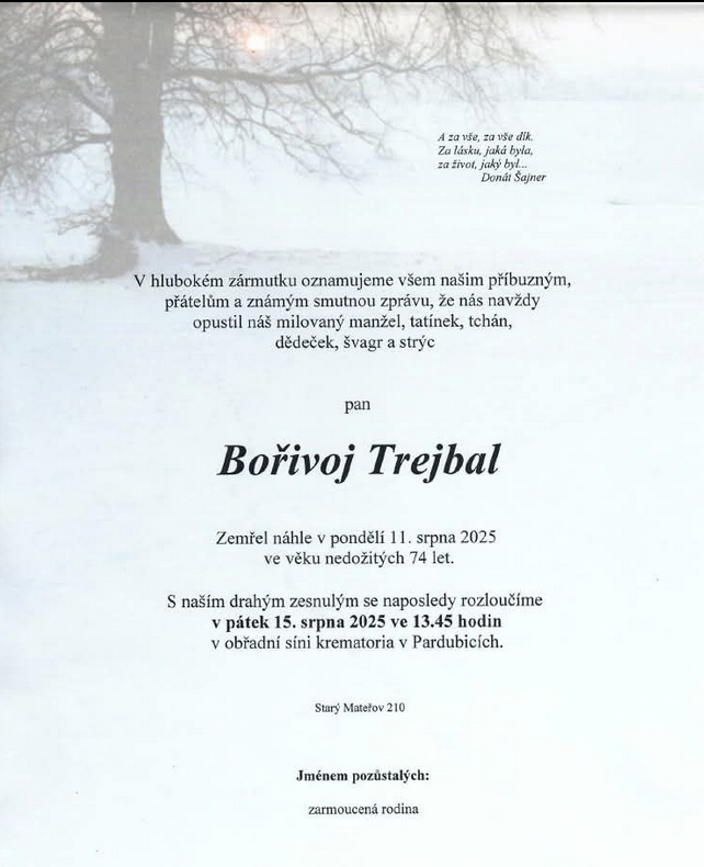 Příbuzní, přátelé a ragbisté se s Bořivojem Trejbalem rozloučí v pátek 15. srpna 2025 v krematoriu v Pardubicích od 13:45 hodin.